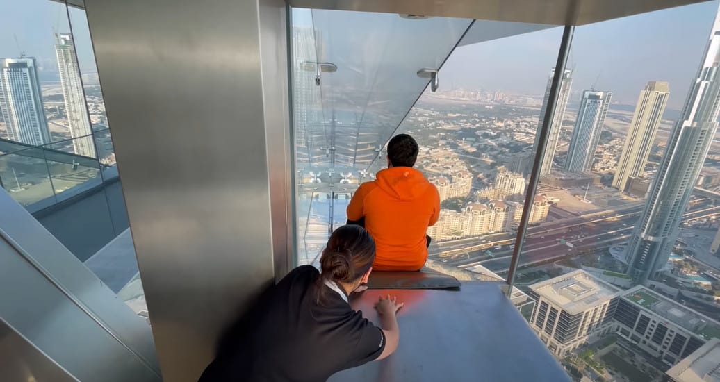 יש לכם נוף יפהפה על מרכז העיר דובאי והבורג' ח'ליפה. הליכה על רצפת הזכוכית בגובה מטורף כל כך הוא משהו שלא תשכח, החלקה במנהרת הזכוכית בחלק החיצוני של הבניין היא רעיון מהנה ומקורי שאין כמותו בעולם!